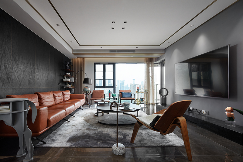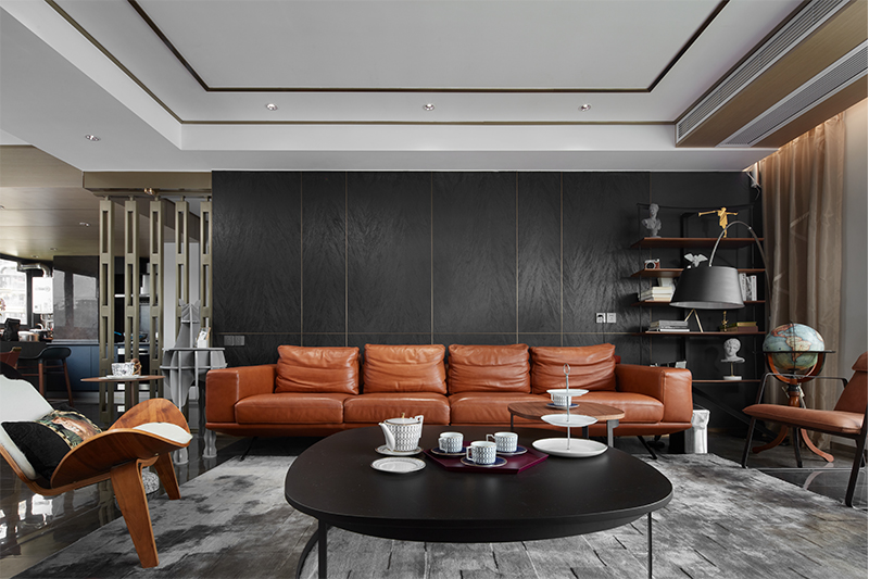 客廳采用了LEDINI進口免漆板Atlas黑作為背景墻,它獨特的石紋時尚個性,