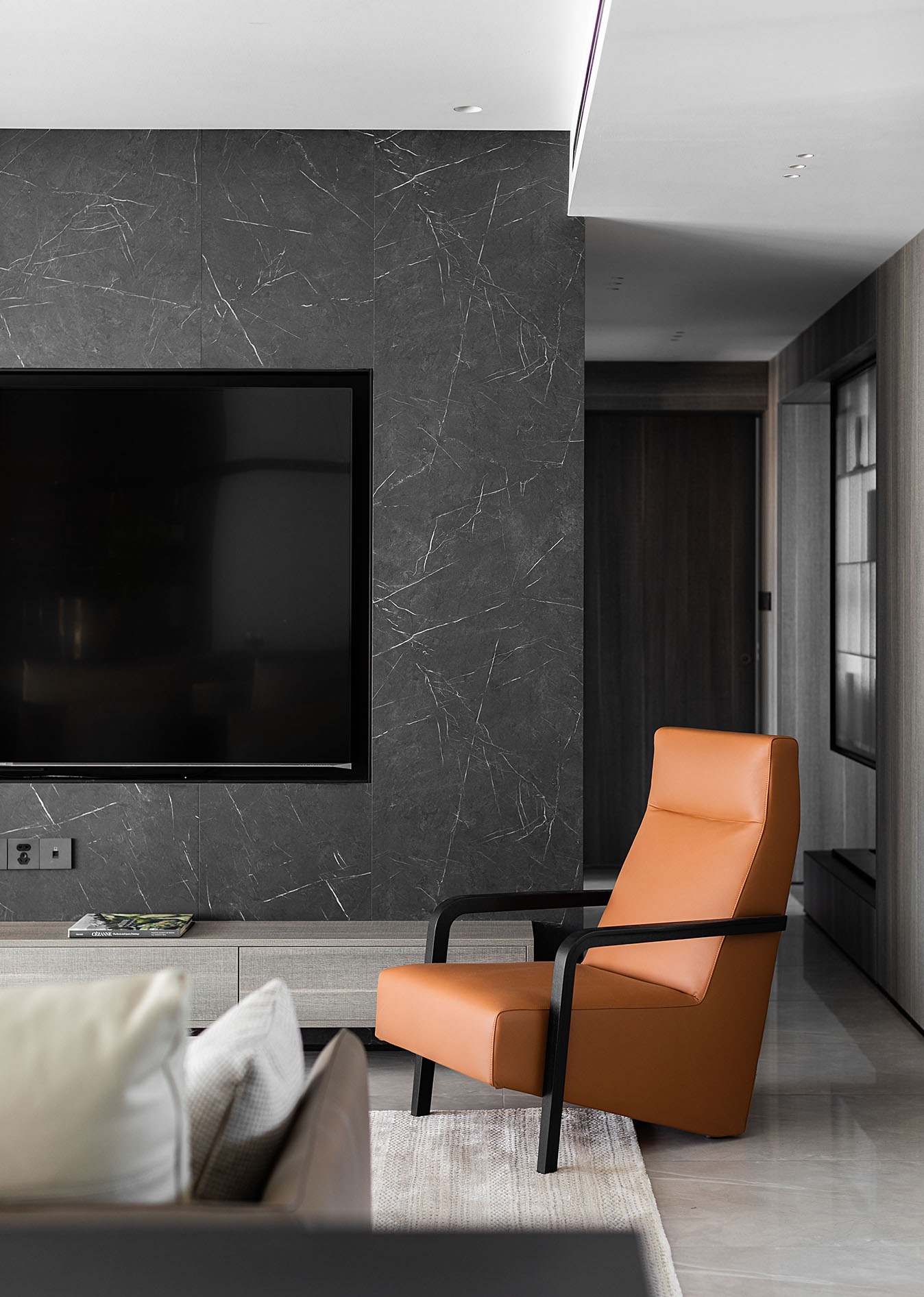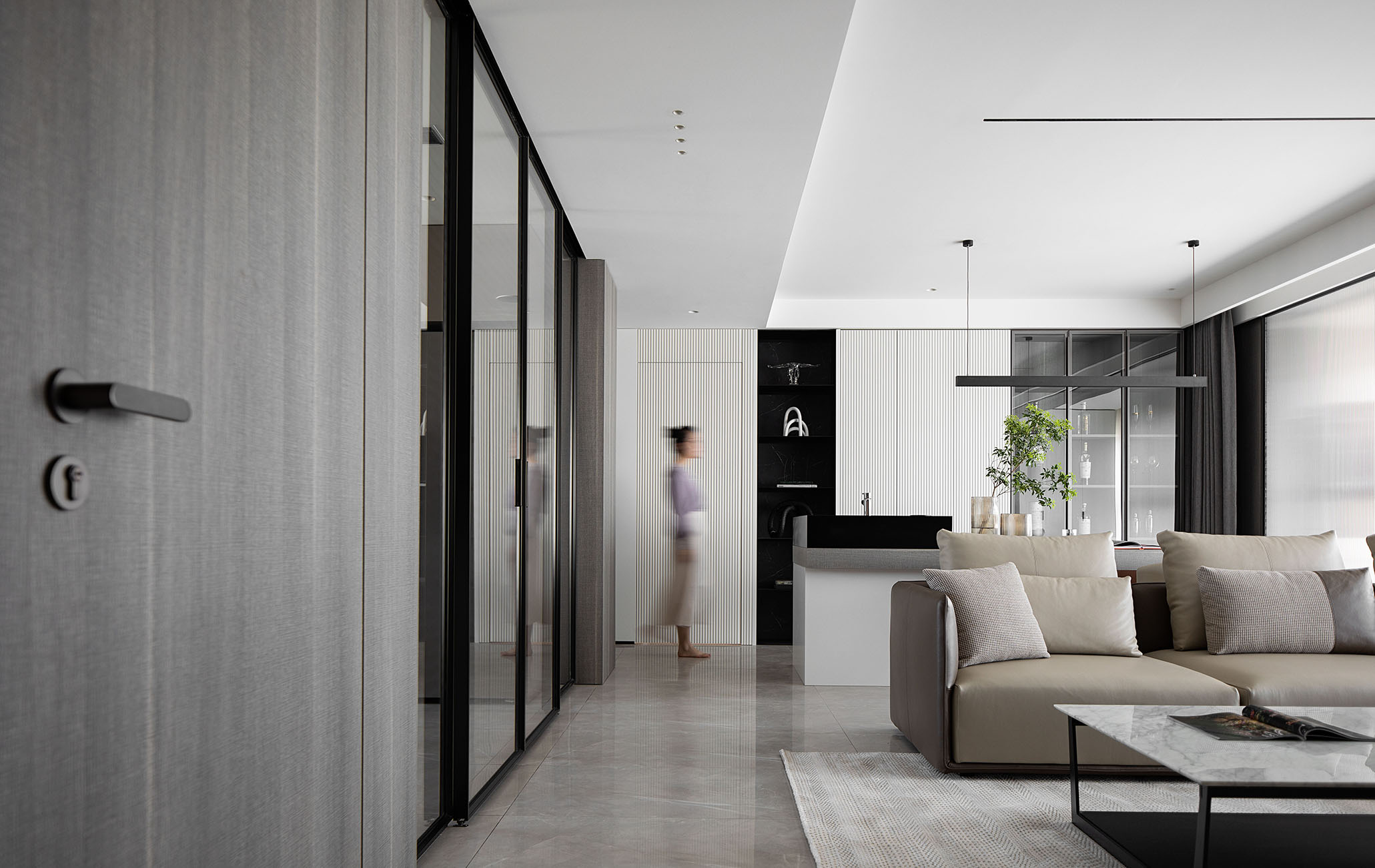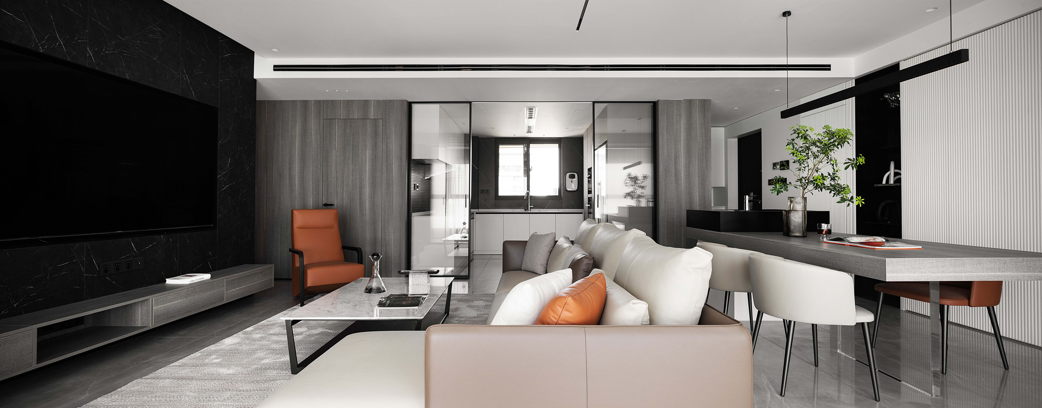 逼真的高級灰大理石紋理、柔和的駝灰色沙發、隔而未隔的鋁框玻璃移門,