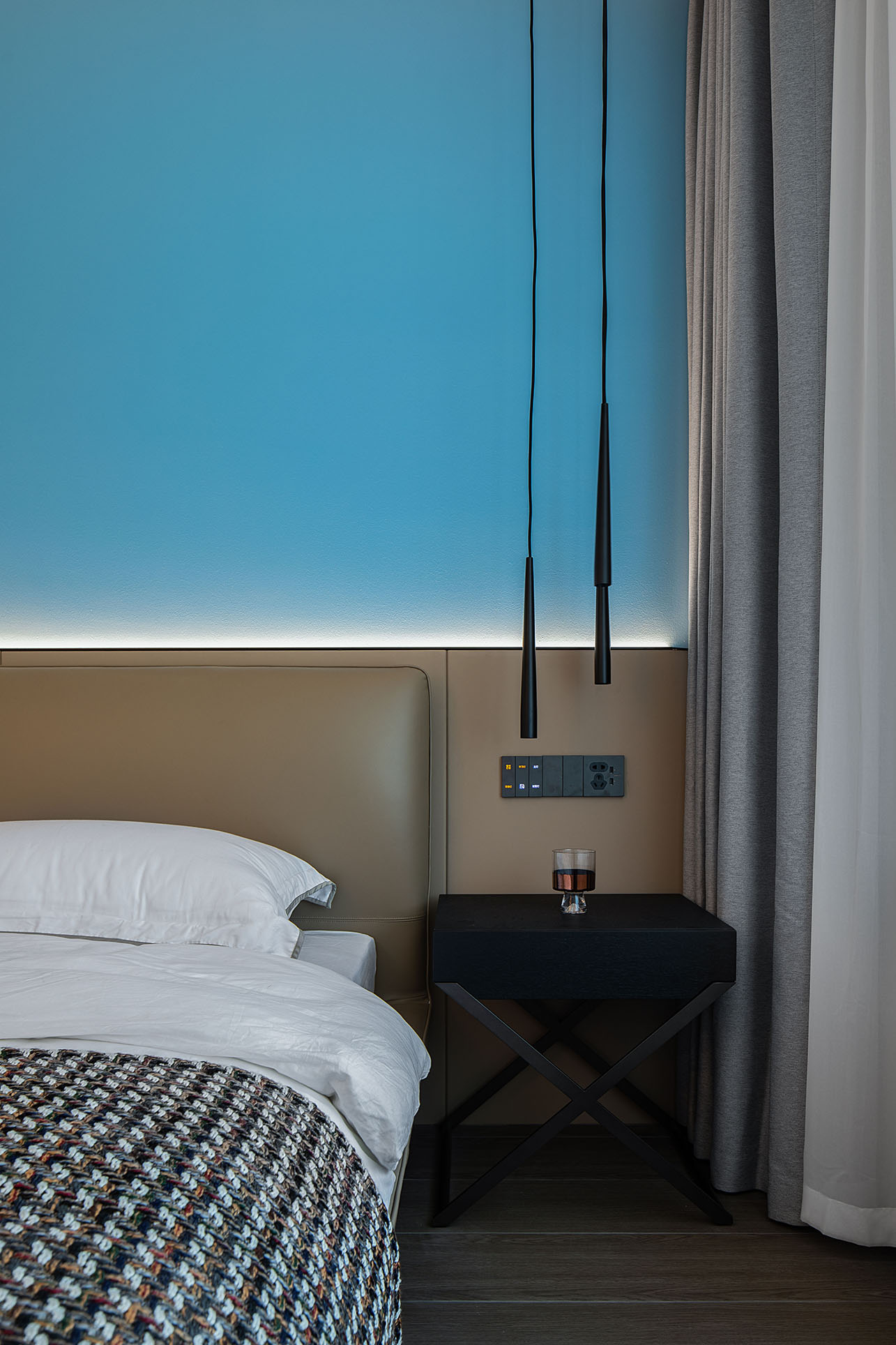 夜幕降臨,柔和的燈光傾灑而下,落到墻上和床上,