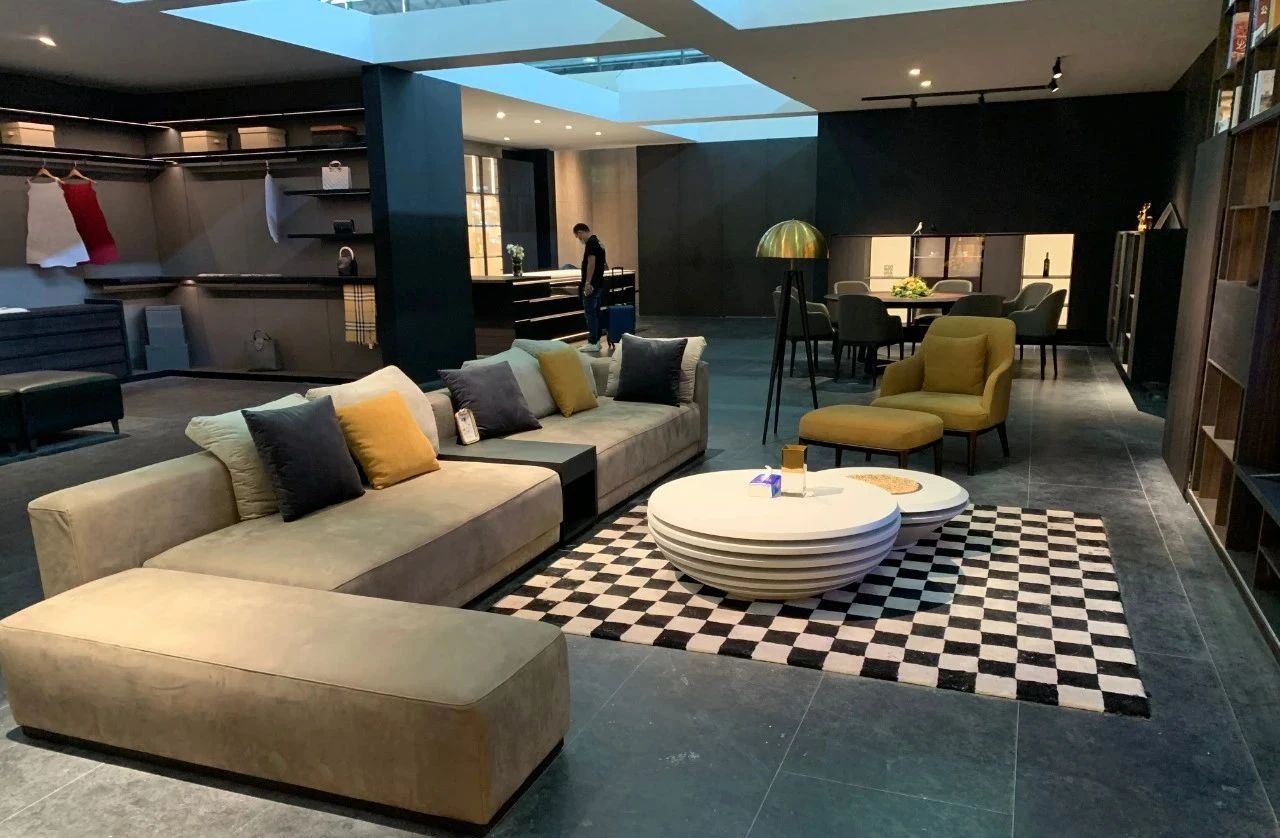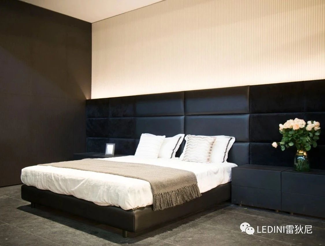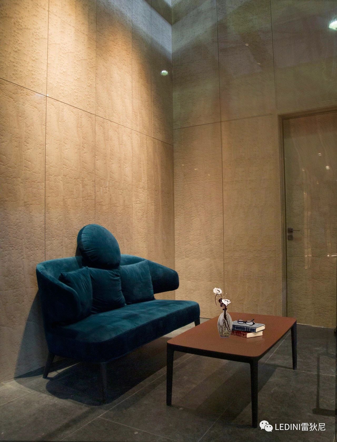 配套的軟裝是LEDINI打造的新品意大利牛皮和布藝沙發,