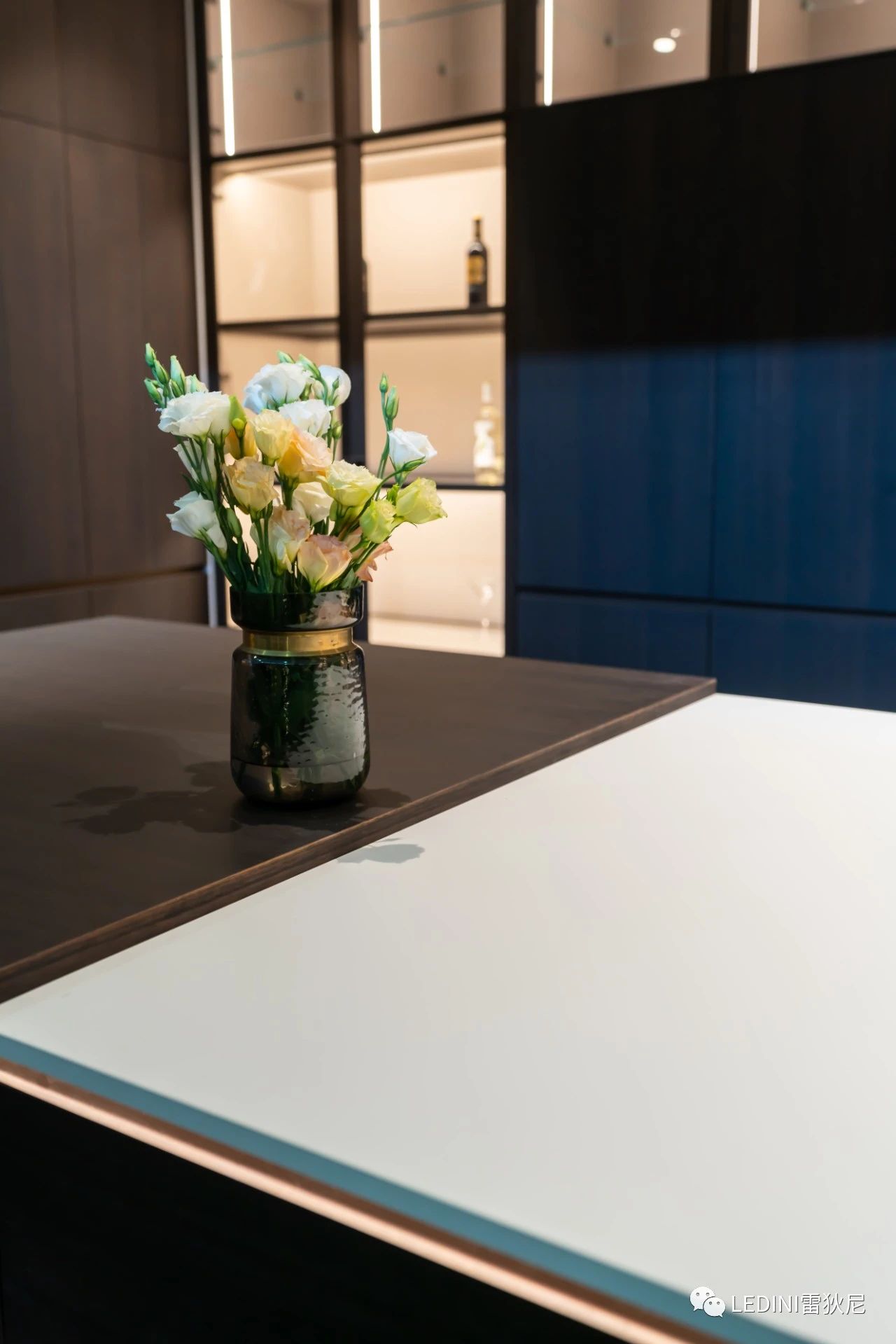 鋁框玻璃柜、白色臺面則提升了視覺亮點,