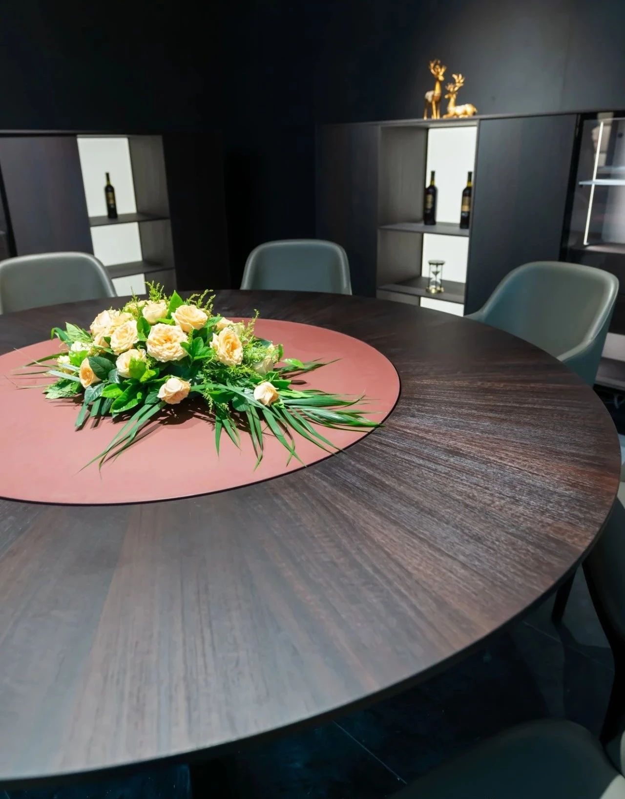 圓形餐桌采用了木皮放射紋拼貼工藝,