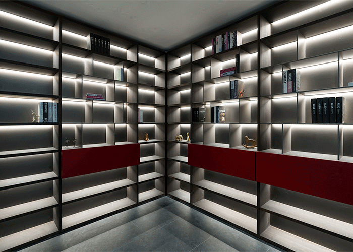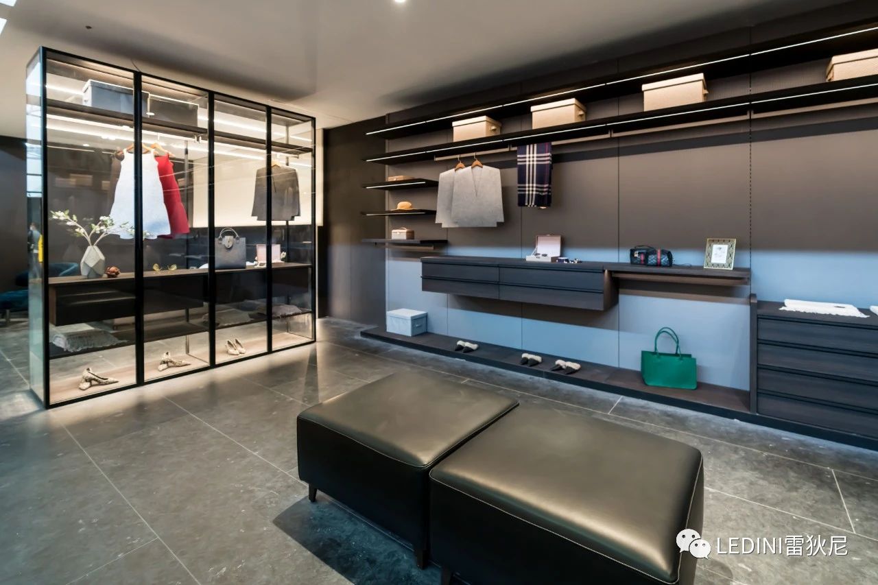 舒適的意大利小牛皮沙發凳,通透的玻璃柜讓整個空間顯得硬朗且高貴,紳士格調十足。