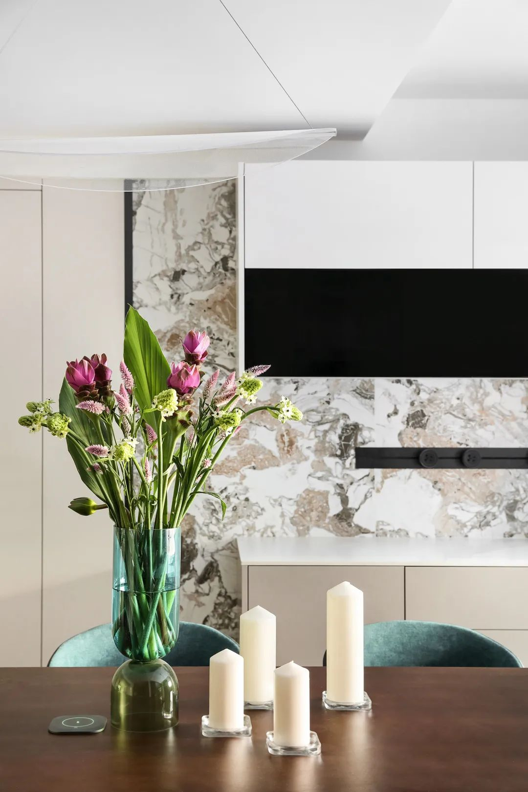 備餐區(qū)同樣采用了0度膚感漆工藝,大面積的白色點(diǎn)綴大理石紋,
