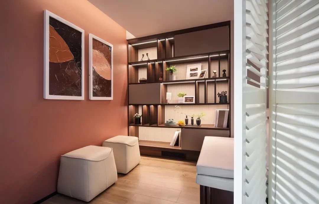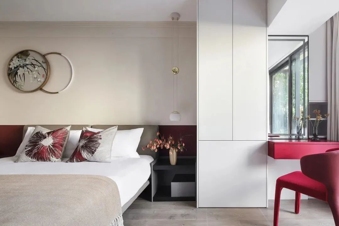 鮮艷的梳妝臺(tái)也是專(zhuān)屬定制,整體采用膚感工藝,造型簡(jiǎn)約,優(yōu)雅大方。