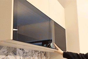 備餐區(qū)吊柜,采用了電動(dòng)上翻門(mén)的裝置,方便高處取物。