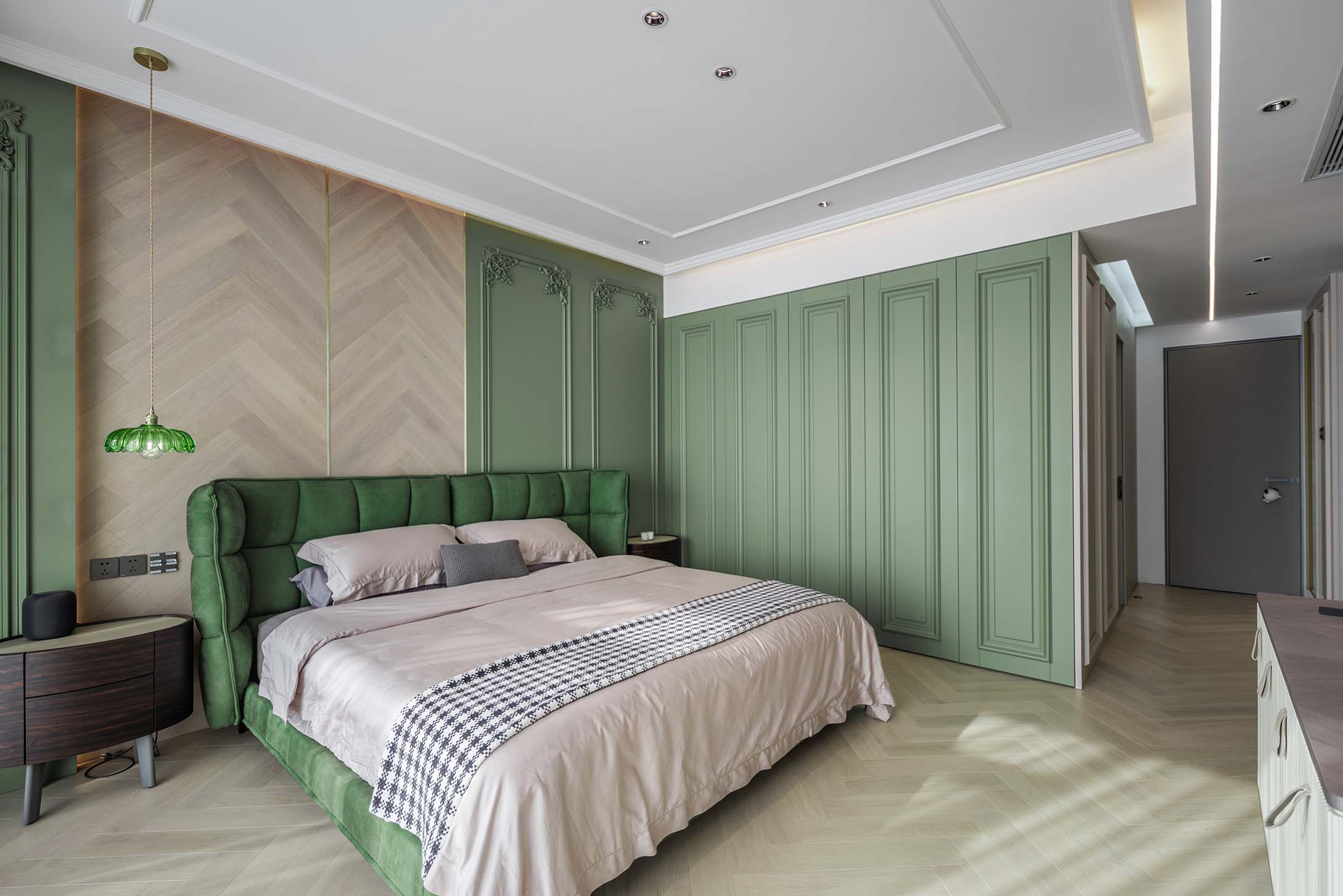 主臥以綠色和灰色調為主,很愜意,很治愈。