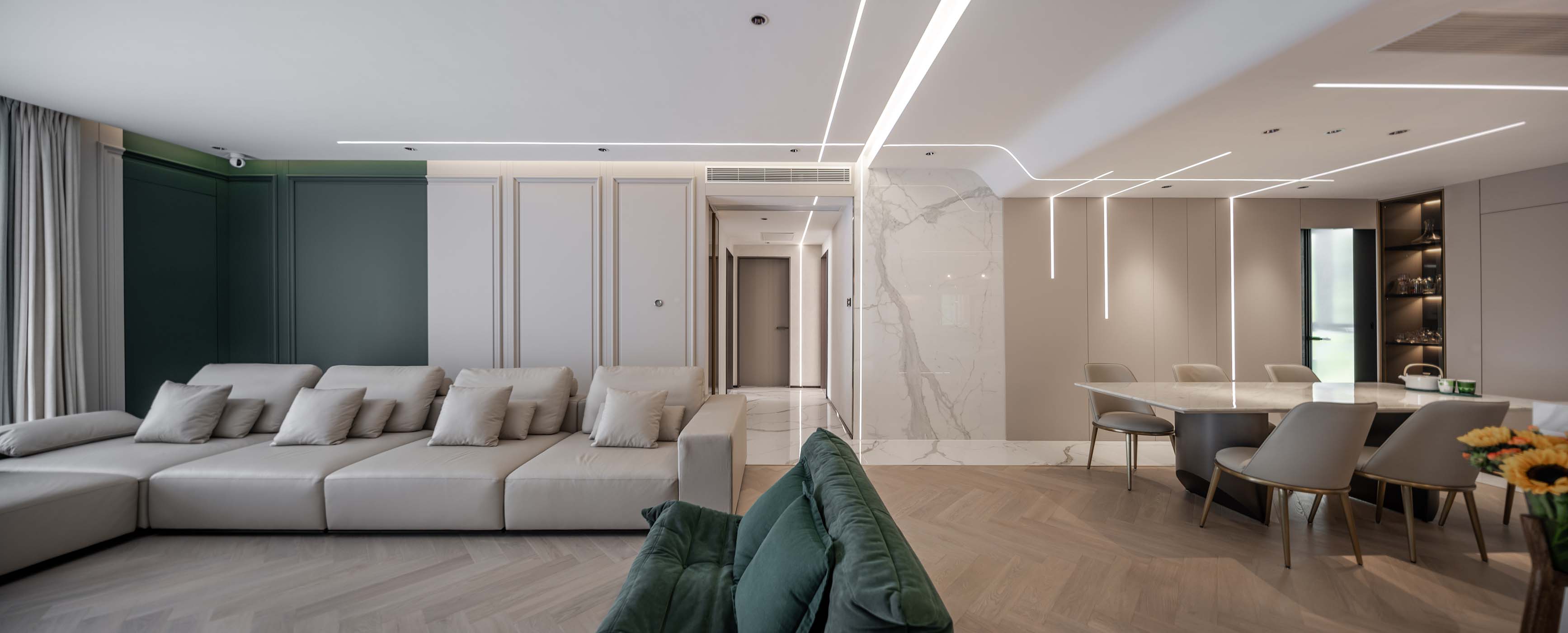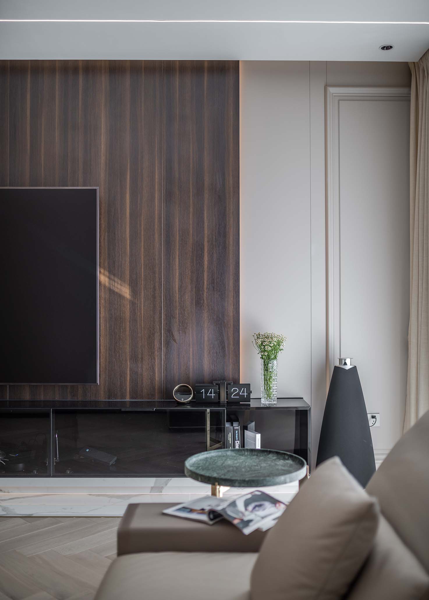 大面積的木紋理自然傾瀉而下,燈帶的點綴賦予空間奢華的高級感。
