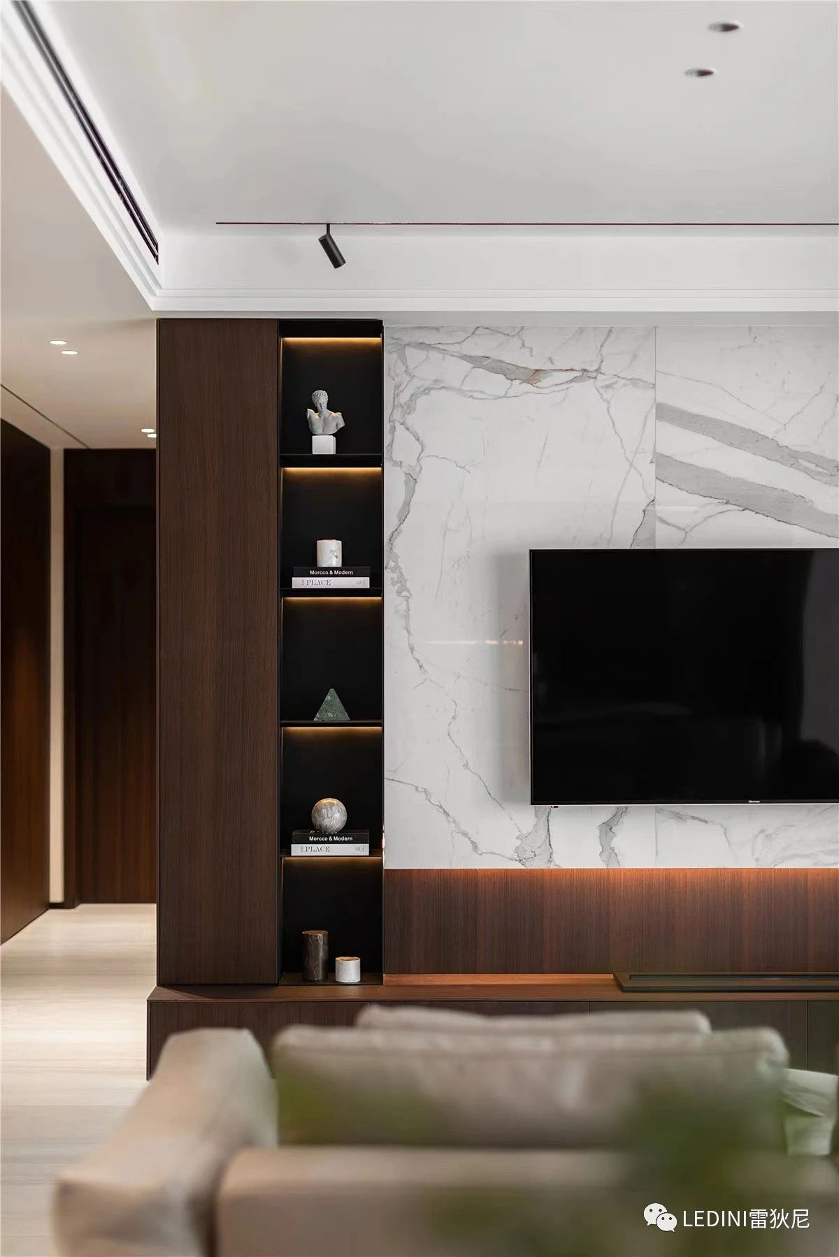 本案中,設計師選用了LEDINI進口煙熏橡木木皮為主要元素,