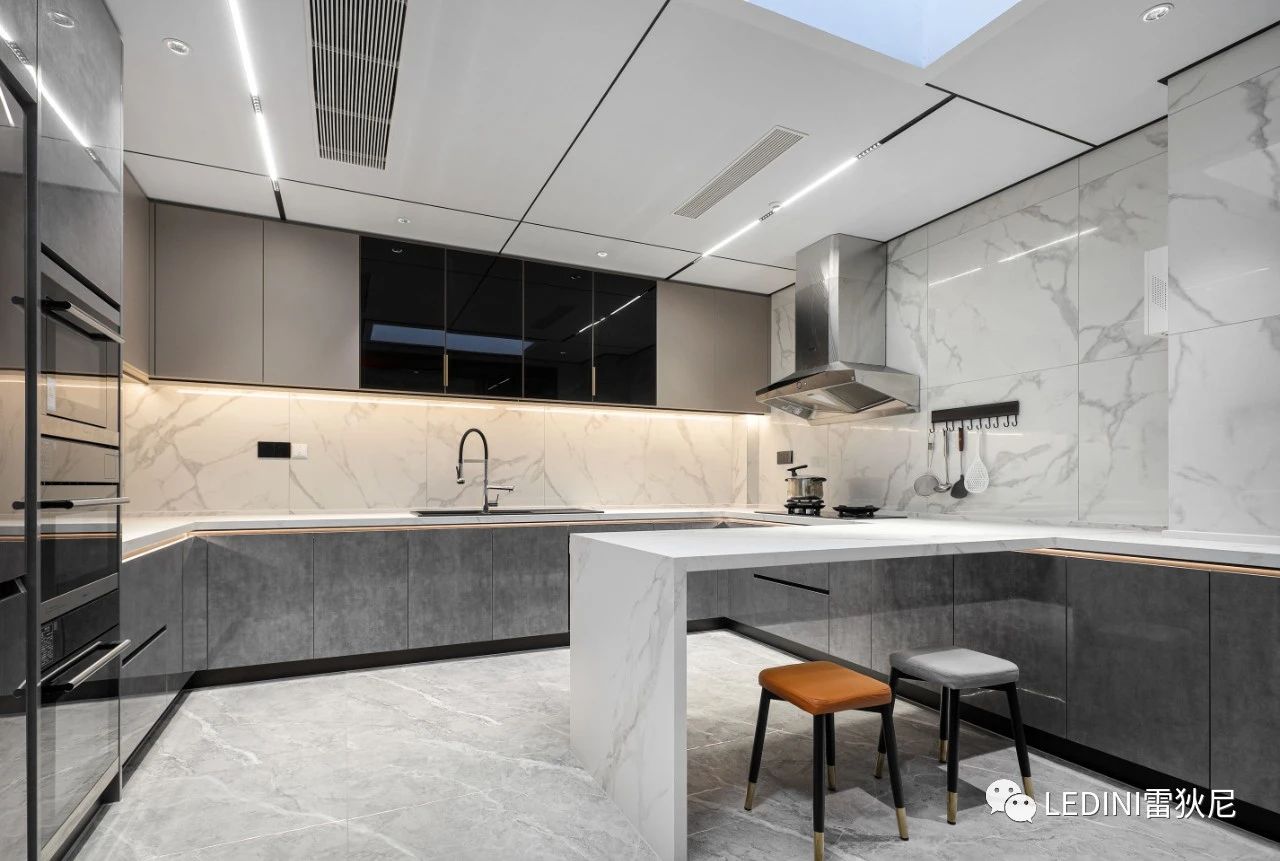 本案中,設計師主要選用雷狄尼進口烤漆搭配天然的大理石紋,