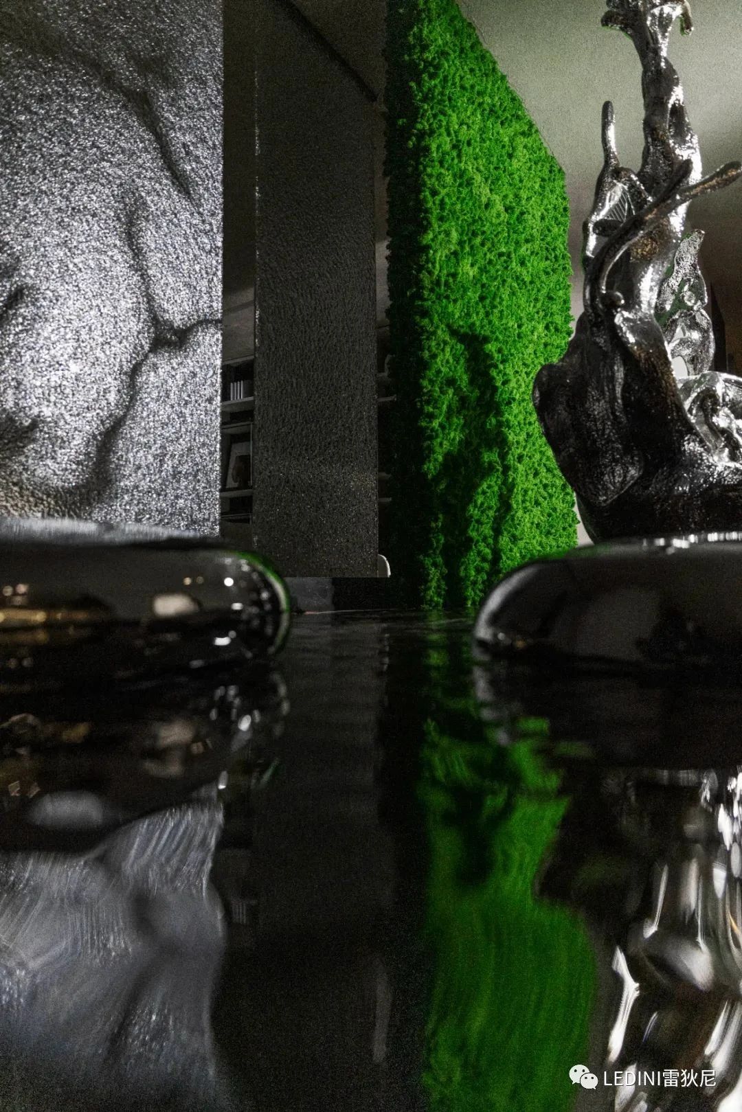 銀色金屬和黑色大理石兩種材質注入水紋肌理將上下界面關聯,