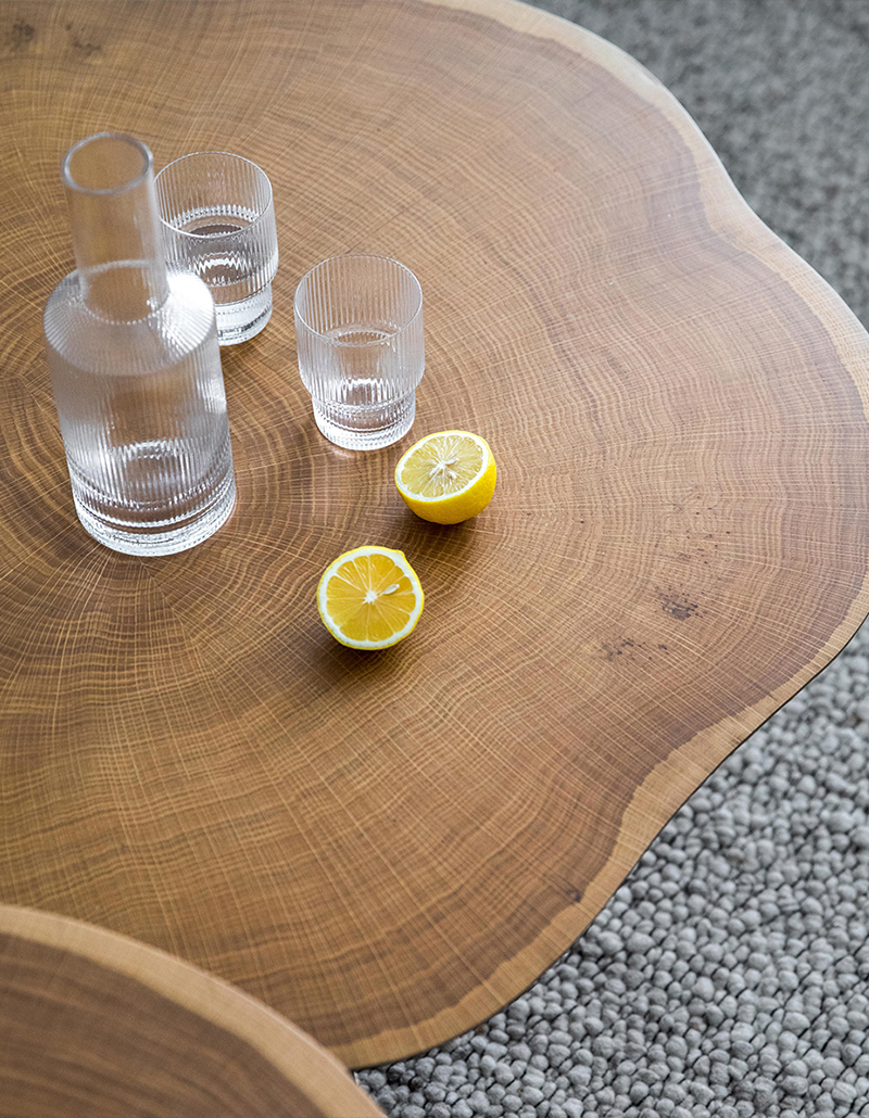 木紋護墻、米白色沙發平和舒緩,將自然氣息引入家中;